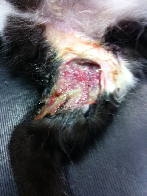 Esta menina foi encontrada ontem num tubo de passagem de água. Foi uma grande amiga da EG que a viu e enquanto não a apanhou não descansou, ainda levou umas quantas arranhadelas, não por ser brava mas simplesmente porque estava ferida e assustada. Já foi ao Vet logo de manhã e já está a ser tratada.