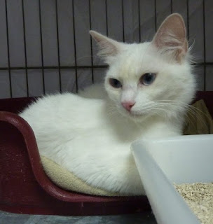 Esta menina é a Reani. Branquinha como um floquinho de neve e meiga como o mel, a Reani chegou até nós vinda dos Açores onde lhe restava uma vida curta e triste. Hoje está connosco e todos os dias nos deliciamos com a sua doçura. Mas sabemos que a Reani precisa e merece muito mais do que a atenção que lhe conseguimos dar. É linda, novinha e meiga, que mais se pode pedir de um gato? Onde anda a família-metade da Reani? Quem se apaixona por esta menina tão meiguinha?